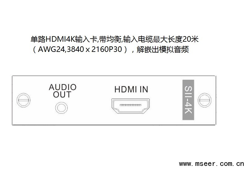 SII-4K HDMI單通道4K輸入卡(兼容2K),配合SMD系列主機使用,采用獨立板卡設(shè)計,每塊卡支持1路HDMI輸入,帶均衡,輸入電纜最大長度20米(AWG24,3840ⅹ2160P30),解嵌出模擬音頻,支持最高3840ⅹ2160P30的數(shù)字高清圖像傳輸。