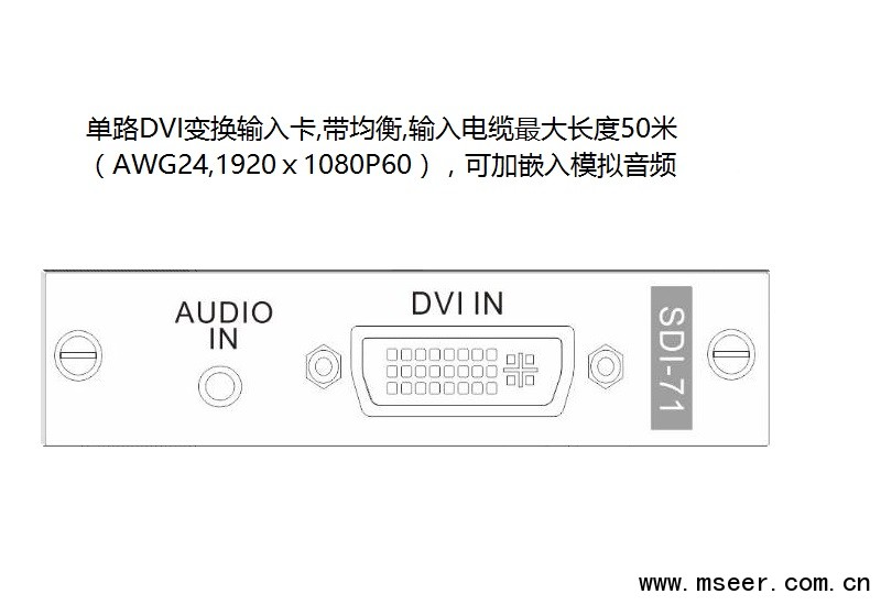 SDI-71 DVI 單通道變換輸入卡,配合SMD主機(jī)使用,采用獨(dú)立板卡設(shè)計(jì),每塊卡支持1路DVI-D輸入,帶均衡,輸入電纜最大長(zhǎng)度50米(AWG24,1920ⅹ1080P60),可加嵌入模擬音頻,支持最高1920x1200P60的數(shù)字高清圖像傳輸.