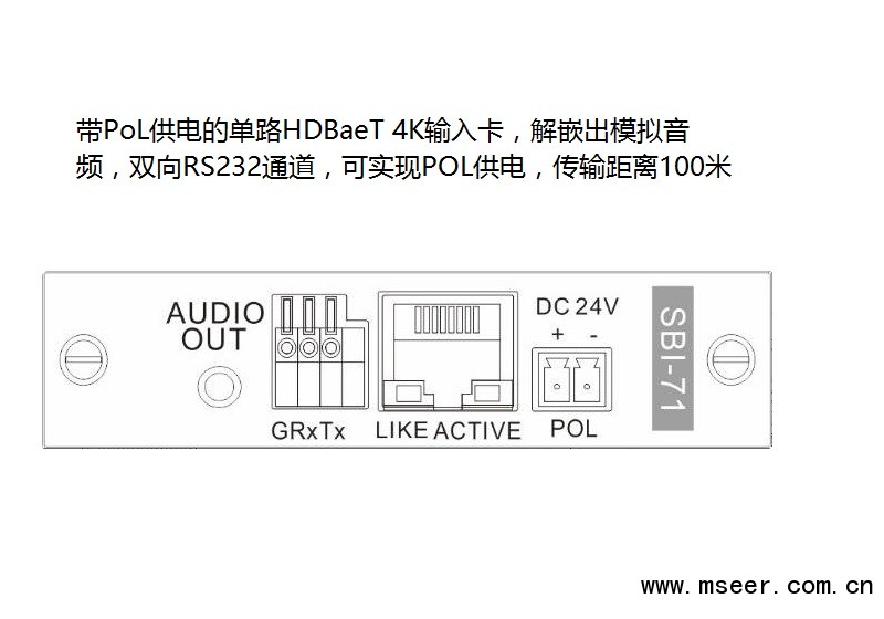 SBI-71 HDBaseT單通道變換輸入卡,配合SMD主機及墻插、桌插、地插使用,采用獨立板卡設(shè)計,每塊卡支持1路HDBaseT輸入,雙向RS232通道,解嵌出模擬音頻,可實現(xiàn)POL供電,傳輸距離100米,支持最高1920x1200P60的數(shù)字高清圖像傳輸.