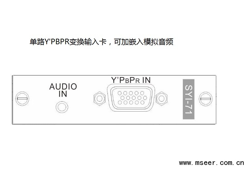 SYI-71 Y'PBPR單通道變換輸入卡,配合SMD主機使用,采用獨立板卡設計,每塊卡支持1路Y'PBPR輸入,可加嵌入模擬音頻,支持最高1920x1080P60的高清圖像傳輸.