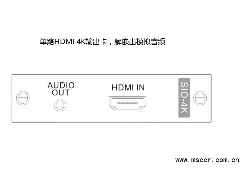 SIO-4K HDMI單通道4K輸出卡(兼容2K),配合SMD主機使用,采用獨立板卡設計,每塊卡支持1路HDMI輸出,解嵌出模擬音頻,支持最高3840ⅹ2160P30的數字高清圖像傳輸.