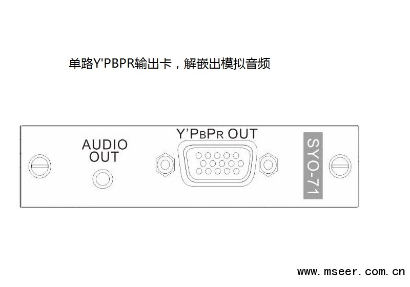 SYO-71 Y'PBPR單通道變換輸出卡,配合SMD主機使用,采用獨立板卡設計,每塊卡支持1路Y'PBPR輸出,解嵌出模擬音頻,支持變換至最高1920x1200P60的數字高清圖像傳輸.